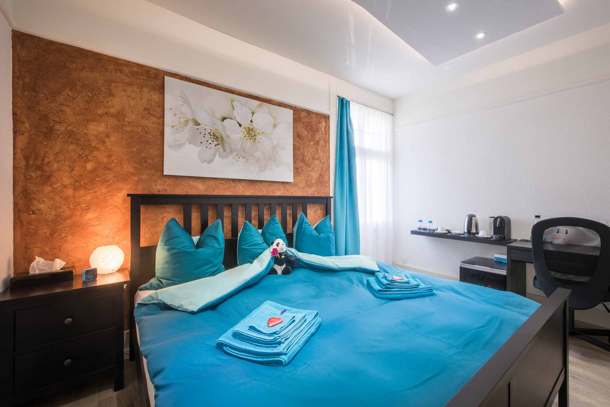 Free-of-charge WiFi access, telephone with free domestic-calls, satellite TV, Nespresso coffee-machine, tea-service with electric kettle as well as minibar and snack-box are available in your room.